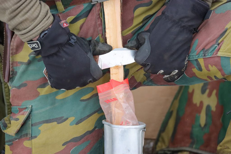 A tűz meggyújtásához gyufa vagy öngyújtó nem megengedett. Az belga hegyivadászok szikragyújtó segítségével próbáltak életet lehelni a tűzbe, a szikrákat közvetlenül a korábban lehántott faforgácsra irányították. A páratartalom, a hó miatt ez nehéz első alkalommal, de végül mindenkinek sikerült.