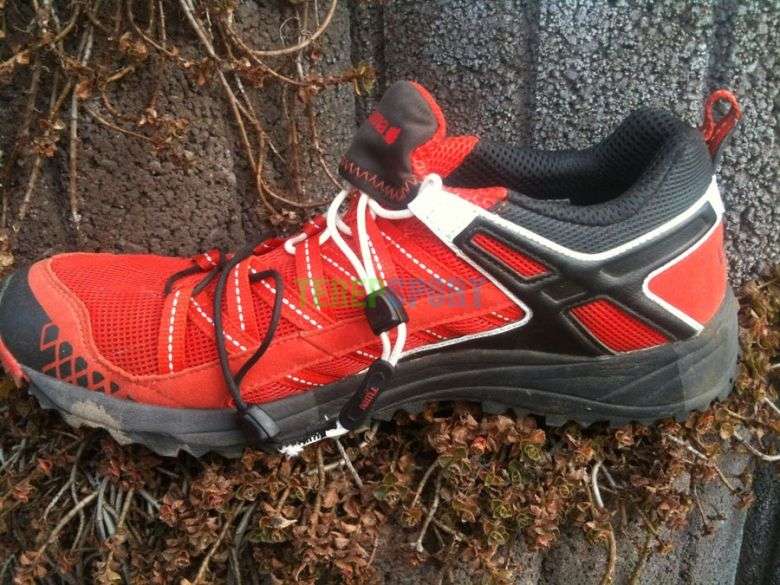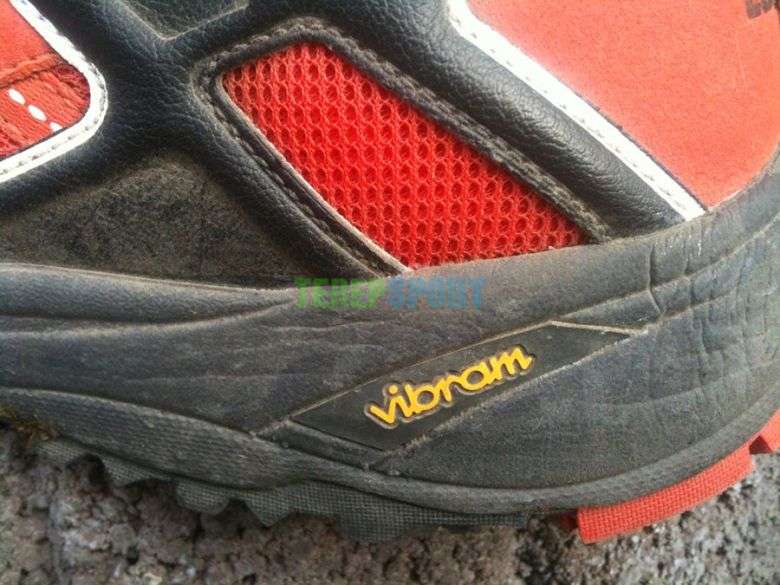 Kialakítás: Amikor felpróbáltam (nagyon kényes vagyok az első benyomásra) éreztem, hogy nagyon stabil talpszerkezettel van megáldva, remekül elfekteti a talp teljes terjedelmét. A sarok és oldalmerevítések nem hagyják csúszkálni a lábat, ha mégis akkor a két ponton rögzíthető és állítható Twin-Lace fűzőrendszerrel a talp igényeihez lehet alkalmazkodni. Fontos volt számomra az is, hogy a nyelv nem különálló egységet alkot a cipővel, ezzel megakadályozva a nyelv elcsúszkálását begyűrődését, hanem egy anyagból megoldva kapott helyet. A talpszerkezetet tekintve a mára már jól ismert, elismert Vibram Vitesse megoldást található, ennek én nagyon örültem, mert aki a terepfutás viszontagságait ismeri az rögtön megismeri az előnyét ennek a kialakításnak.