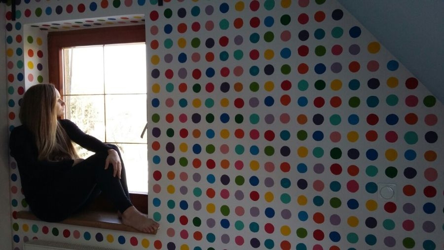3) Kezdhetünk pöttyözni. Minden szín után moshattam a szivacsot, és a tálat is. Az akril festék igazán gyorsan szárad. Az első színnél még vizeztem a festéket, mert azt hittem kevés lesz, de ez hiba. Ne tedd, mert a festék túl vizes lesz, a száraz szivacs meg felszívja, és ahogy rányomod a falra végig csurog a szép fehér falon, és javíthatod fehérrel. Velem 3 szor fordult elő, míg rájöttem nem csak az a titka, hogy ne legyen a festék vizes, de a szivacs se legyen száraz. Mert akkor meg a tömény festéket szívja fel. Szóval bevizezed a szivacsot, jo alaposan kicsavarod, és a tiszta akril festéket használva pöttyözöl. Vagyis nekem ez vált be a legjobban. Természetesen nem volt tökéletes, még így se, szóval az összes pöttyöt át festettem még ecsettel külön. Nem akartam tökéletes kör alakú pöttyöket, szóval eldeformálódas egyáltalán nem zavart. (A festék meg bőven elég, a másik ötletemre is elég lett végül, kivéve a fehér, a keverés miatt.)